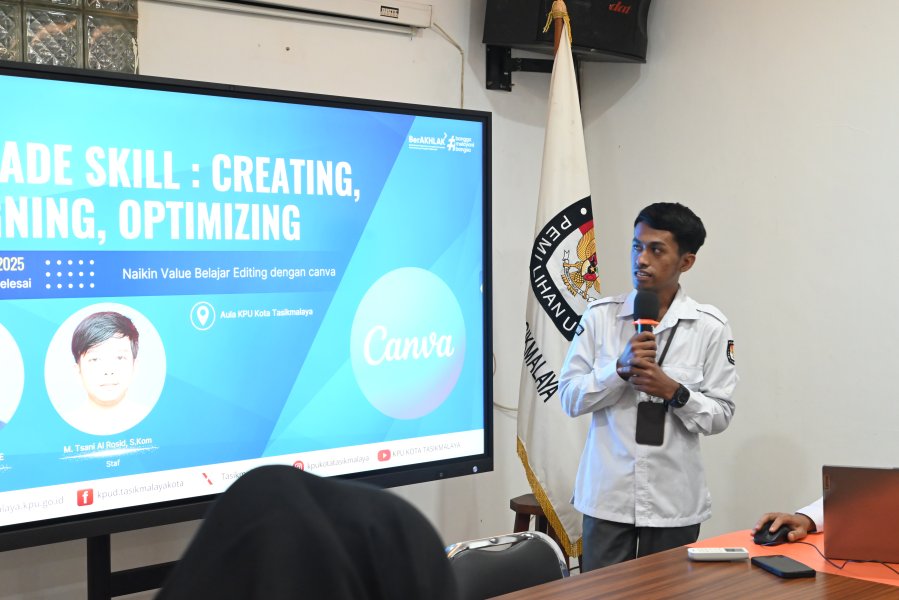 Kota Tasikmalaya - Sebagai upaya berkelanjutan untuk memperkuat kemampuan sumber daya manusia di bidang publikasi dan komunikasi digital, KPU Kota Tasikmalaya kembali menggelar kegiatan Upgrade Skill : Dari Ide Jadi Karya dengan tema “Produksi Ide Menarik dengan CapCut” di Aula KPU Kota Tasikmalaya, Senin (20/10) Pelatihan ini diikuti oleh jajaran sekretariat dan tenaga pendukung KPU Kota Tasikmalaya dengan Hanif Faishal sebagai narasumber ang membagikan pengalaman, tips, dan teknik kreatif dalam mengolah ide menjadi karya visual yang menarik, komunikatif, dan relevan dengan kebutuhan publikasi KPU. Kegiatan ini merupakan bagian dari program peningkatan kapasitas pegawai yang secara rutin dilaksanakan untuk mendukung keterbukaan informasi publik serta optimalisasi penyebarluasan informasi kepemiluan di era digital. Peserta diajak untuk memahami pentingnya kemampuan mengubah gagasan menjadi konten video yang mampu menarik perhatian masyarakat, khususnya generasi muda yang kini lebih banyak mengakses informasi melalui platform digital. Melalui aplikasi CapCut, para peserta berlatih mengembangkan ide dari konsep sederhana menjadi video edukatif yang informatif dan menarik. Narasumber juga menjelaskan berbagai aspek penting seperti penyusunan alur visual, penggunaan efek transisi, pengaturan musik latar, serta pemilihan teks yang efektif agar pesan dapat tersampaikan dengan jelas dan menarik. Kegiatan ini tidak hanya menitikberatkan pada kemampuan teknis editing video, tetapi juga mengasah kreativitas dan kepekaan peserta terhadap bentuk komunikasi visual yang efektif. Peserta diajak memahami bahwa di era digital saat ini, penyajian informasi tidak cukup hanya melalui teks atau gambar, melainkan harus dikemas secara menarik dan dinamis agar dapat menjangkau audiens yang lebih luas. Pelatihan berlangsung dalam suasana yang interaktif dan inspiratif. Peserta aktif berdiskusi, mencoba berbagai fitur CapCut, serta mempresentasikan hasil karya video pendek yang mereka buat selama sesi praktik. Kegiatan ini menjadi wadah bagi seluruh jajaran KPU Kota Tasikmalaya untuk saling berbagi ide, berkolaborasi, dan berinovasi dalam menciptakan konten publikasi kepemiluan yang kreatif dan bernilai edukatif. Melalui pelatihan ini, KPU Kota Tasikmalaya berharap seluruh peserta mampu menerapkan keterampilan baru dalam mendukung kegiatan sosialisasi dan pendidikan pemilih. Dengan mengolah ide menjadi karya visual yang inspiratif, KPU dapat terus memperkuat citra lembaga sebagai penyelenggara pemilu yang terbuka, informatif, dan dekat dengan masyarakat.