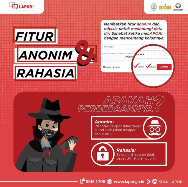 Anonim: Fitur yang bisa dipilih oleh pelapor yang akan membuat identitas pelapor tidak akan diketahui oleh pihak terlapor dan masyarakat umum.