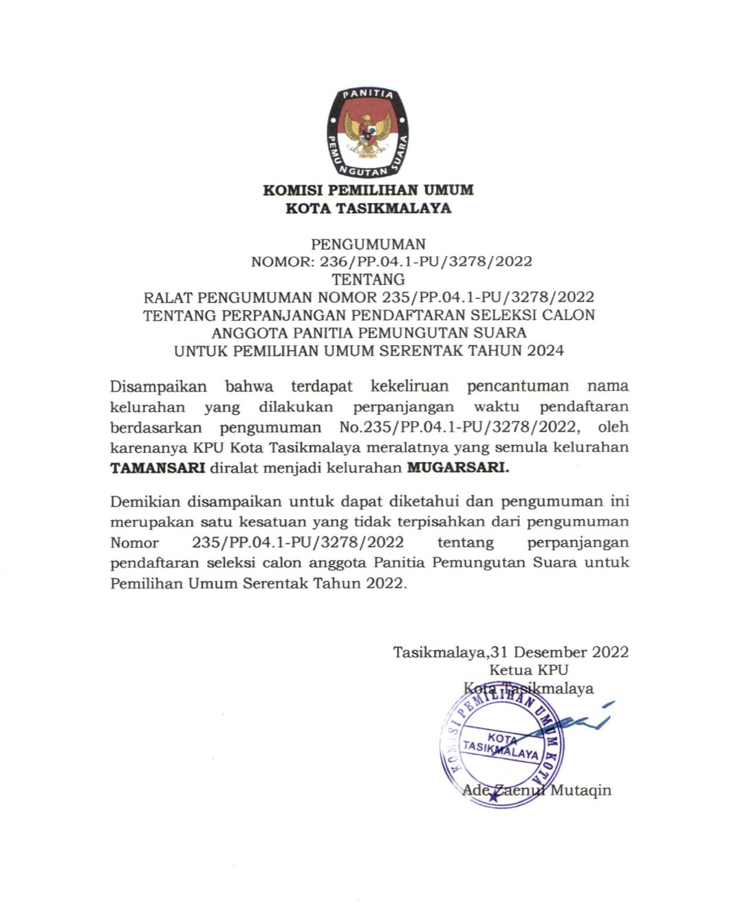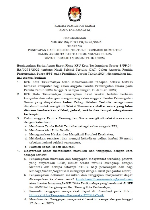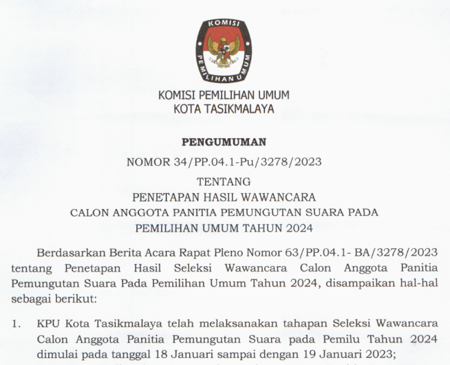 Berdasarkan Keputusan Komisi Pemilihan Umum Republik Indonesia Nomor 6 Tahun 2023 tentang Daerah Pemilihan dan Alokasi Kursi Anggota DPR, DPRD Propinsi dan DPRD Kabupaten/Kota dalam Pemilu Tahun 2024, Daerah Pemilihan (Dapil) dan alokasi kansi untuk Kota Tasikmalaya tidak mengalami perubahan seperti pada Pemilu tahun 2019, yakni empat Dapil dengan alokasi sebanyak 45. Dapil dan alokasi kansi tersebut adalah sebagai berikut: Dapil Kota Tasikmalaya1 meliputi kecamatan Cihideung, Tawang dan Bungursari dengan alokasi kursi 12. Dapil KotaTasikmalaya 2 meliputi kecamatan Indiang dan Tawang dengan alokasi kursi 9. Dapil Kota Tasikmalaya 3 meliputi kecamatan Cibeureum, Tamansari dan Purbaratu dengan alokasi kursi 12. Dan Dapil Kota Tasikmalaya 4, meliputi Kecamatan Kawalu dan Mangkubumi dengan alokasi kursi 12. Sehubungan dengan telah terbitnya keputusan tentang dapil tersebut, KPU Kota Tasikmalaya akan menyosialisasikannya kepada pihak-pihak terkait, khususnya Partai Politik Peserta Pemilu tahun 2024, sebagai salah satu acuan Partai Politik melakukan rekruitmen & menyusun daftar bakal calon anggota legislatif pada pemilu tahun 2024, karena bacaleg tersebut harus disusun berdasarkan dapil tersebut dan alokasi kursi yang tersedia. Jadwal pendaftaran bacaleg oleh Parpol kepada KPU sesuai dengan tingkatannya, berdasarkan Peraturan KPU Nomor 3 tahun 2022 tentang Tahapan dan Jadwal Penyelenggaran PemiluTahun 2024, yaitu mulai tanggal 24 April 2023. Dengan demikian parpol khususnya di tingkat Kota memiliki waktu sekitar sepuluh minggu untuk melakukan rekrutmen dan penyusunan daftar bacaleg tersebut. (Humas KPU Kotas)