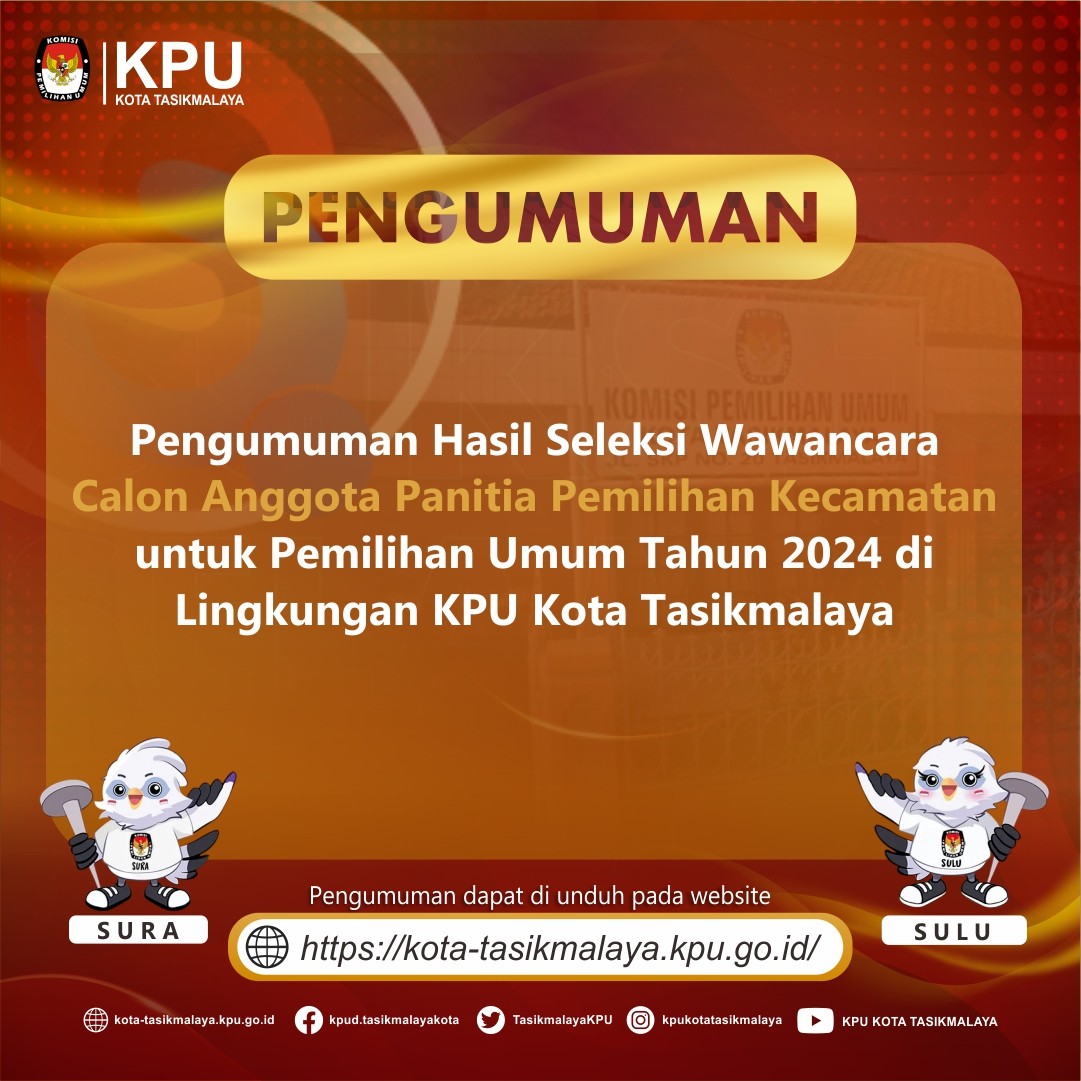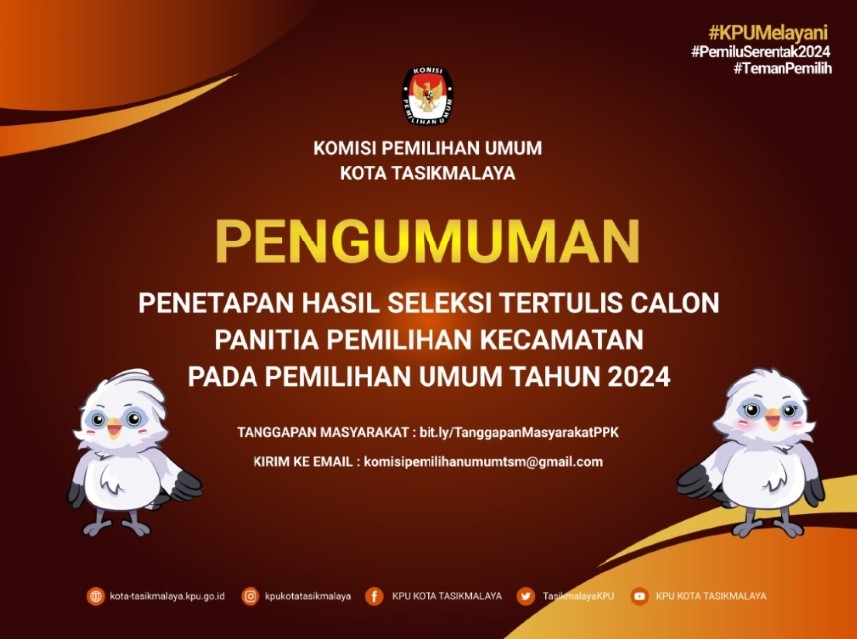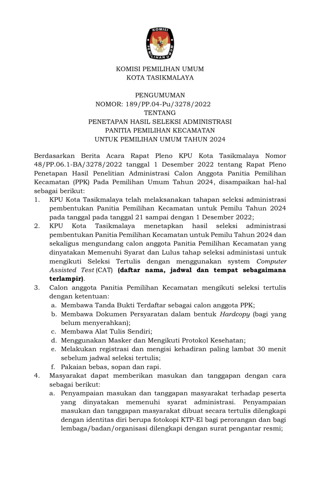 2. KPU Kota Tasikmalaya menetapkan hasil seleksi administrasipembentukan Panitia Pemilihan Kecamatan untuk PemiluTahun 2024 dan sekaligus mengundang calon anggotaPanitia Pemilihan Kecamatan yang dinyatakan MemenuhiSyarat dan Lulus tahap seleksi administasi untuk mengikutiSeleksi Tertulis dengan menggunakan system Computer Assisted Test (CAT) (daftar nama, jadwal dan tempatsebagaimana terlampir).