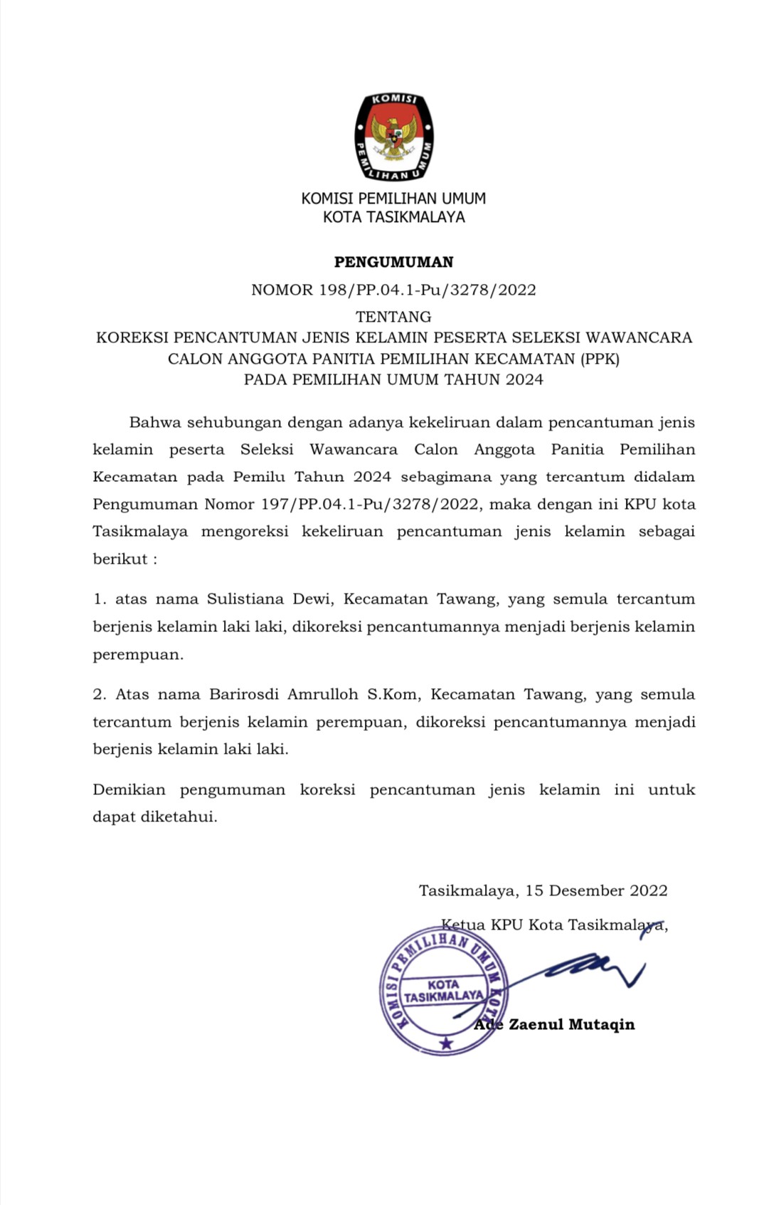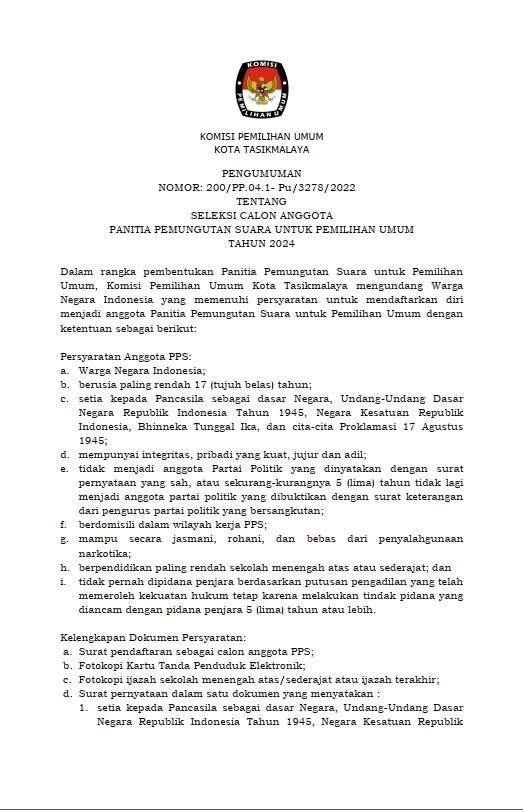Berdasarkan Berita Acara Rapat Pleno KPU Kota TasikmalayaNomor 48/PP.06.1-BA/3278/2022 tanggal 1 Desember 2022tentang Rapat Pleno Penetapan Hasil Penelitian AdministrasiCalon Anggota Panitia Pemilihan Kecamatan (PPK) Pada Pemilihan Umum Tahun 2024, disampaikan hal-hal sebagaiberikut: