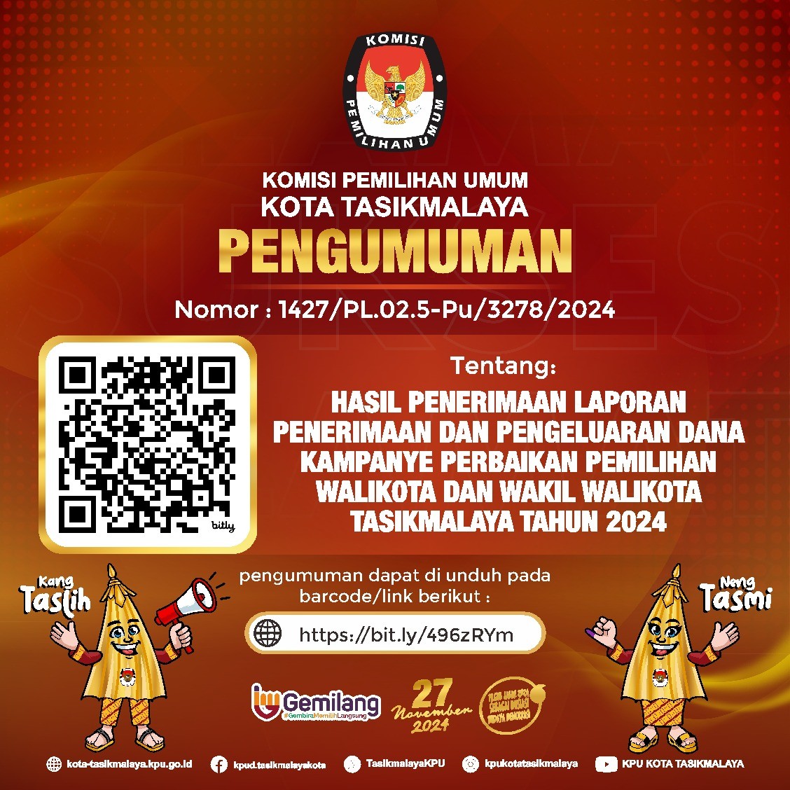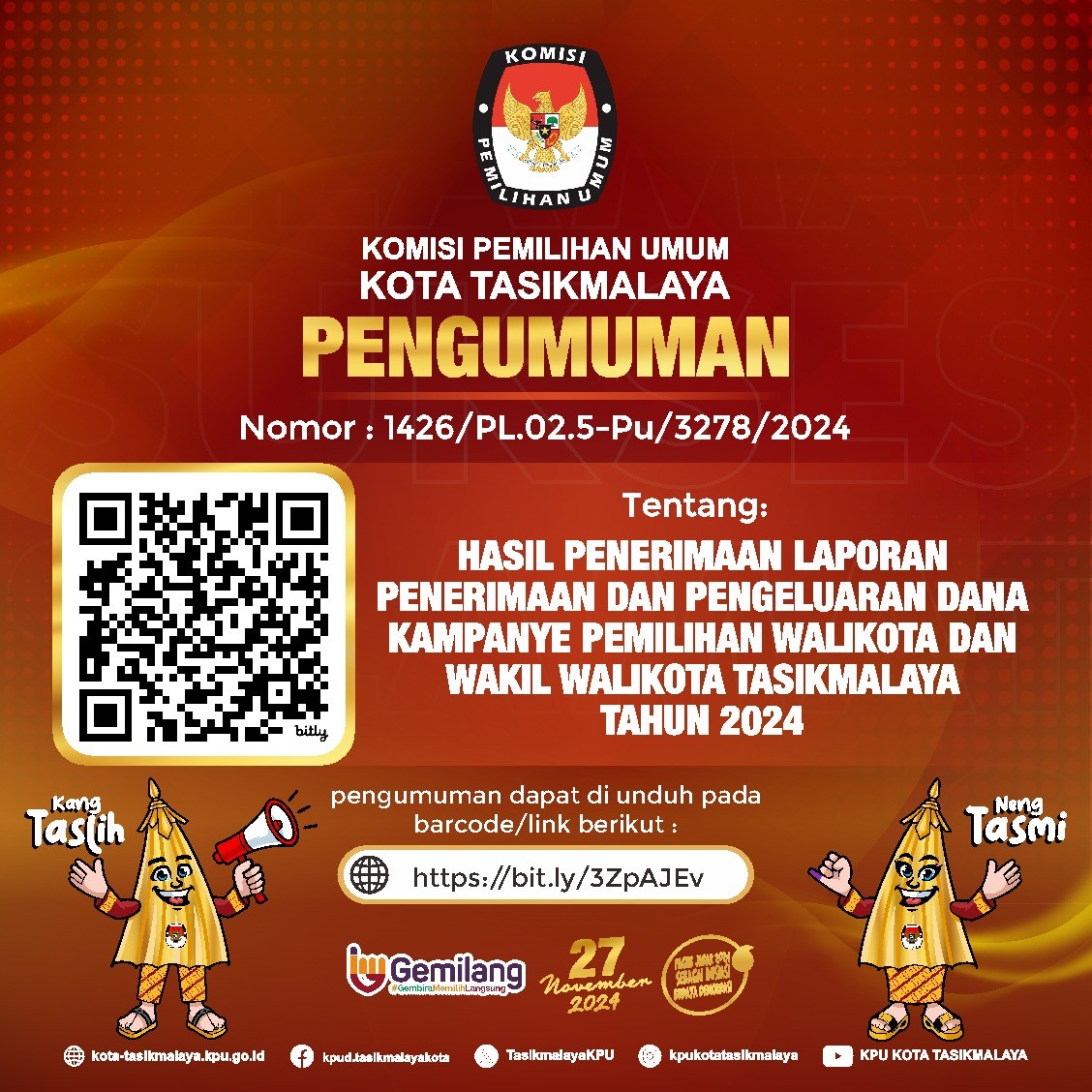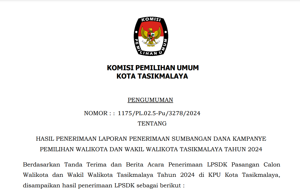 Berdasarkan Tanda Terima dan Berita Acara Penerimaan LPPDK Perbaikan Pasangan Calon Walikota dan Wakil Walikota Tasikmalaya Tahun 2024 di KPU Kota Tasikmalaya, disampaikan hasil penerimaan LPPDK Perbaikan Pasangan Calon Walikota dan Wakil Walikota Tasikmalaya Tahun 2024 yang telah disampaikan pada KPU Kota Tasikmalaya pada tanggal 25 November 2024.