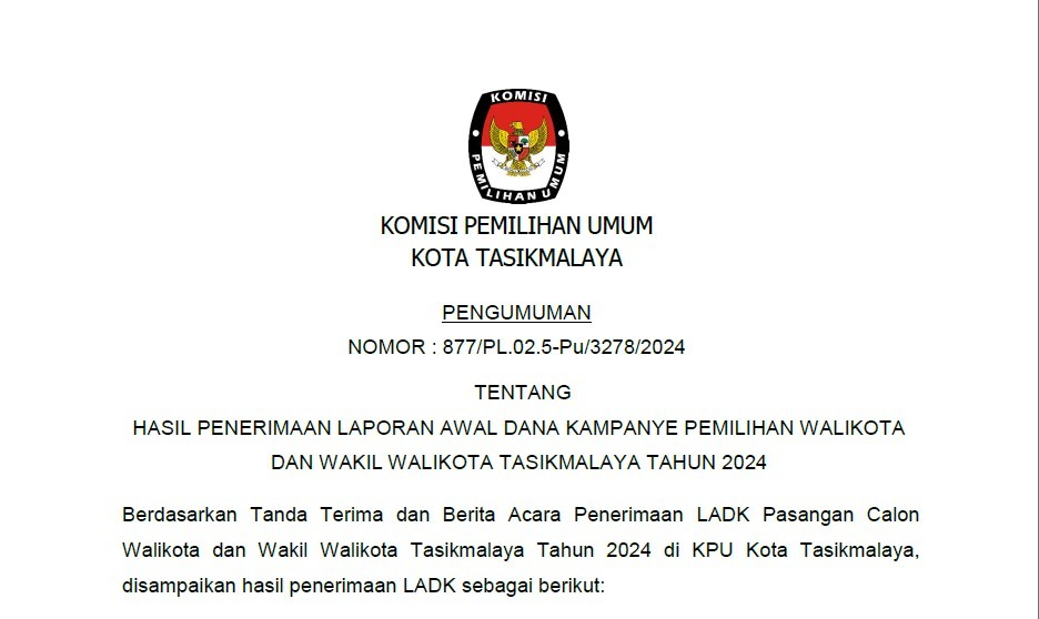 Masukan dan Tanggapan Masyarakat terhadap calon dan/atau Pasangan Calon Walikota dan Wakil Walikota Tasikmalaya pada Pemilihan Walikota dan Wakil Walikota Tasikmalaya Tahun 2024 diterima oleh KPU Kota Tasikmalaya pada tanggal 15 - 18 September 2024.