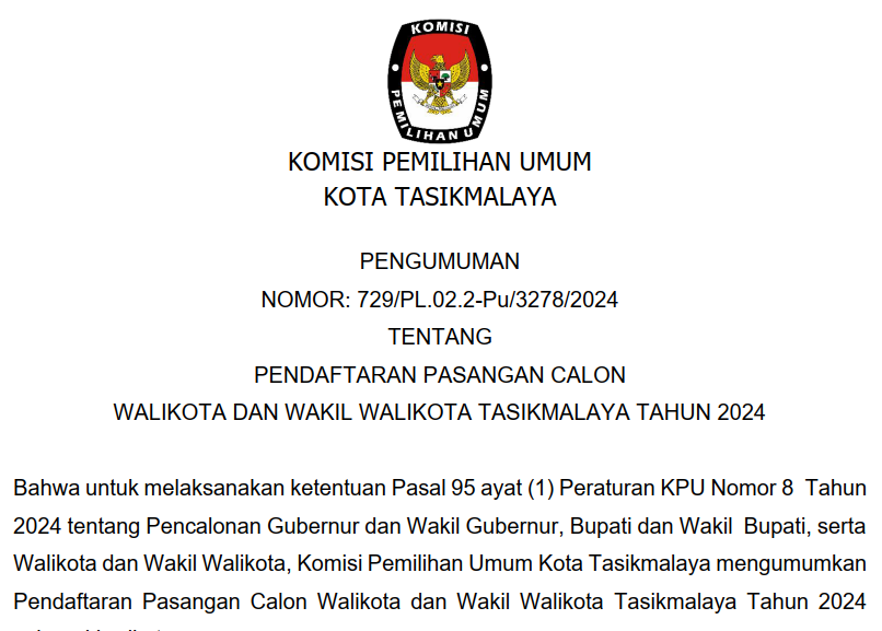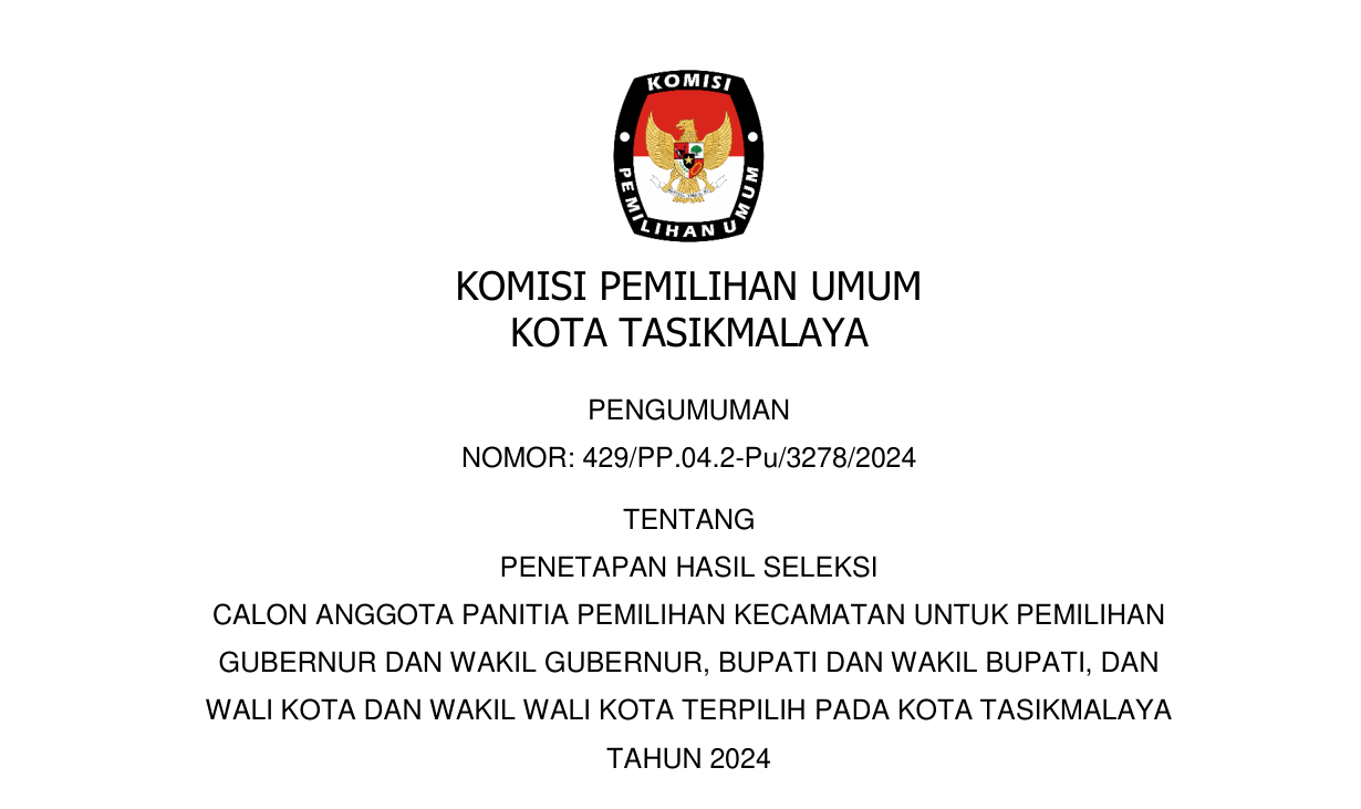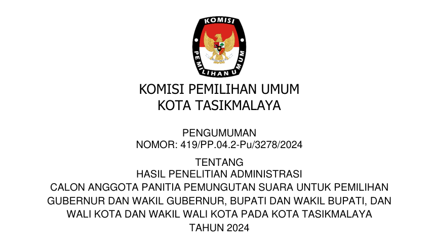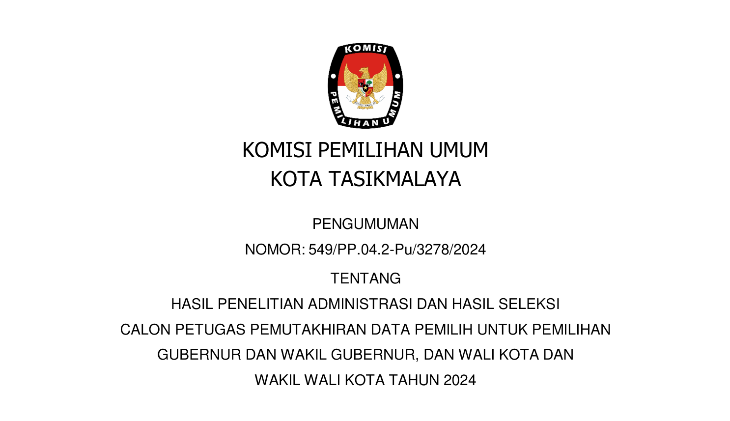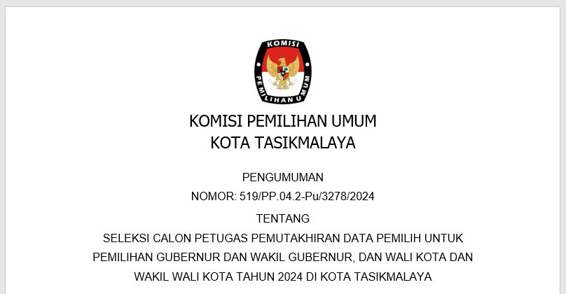 Dalam rangka pembentukan Calon Petugas Pemutakhiran Data Pemilih Untuk Pemilihan Gubernur dan Wakil Gubernur, dan Wali Kota dan Wakil Wali Kota Tahun 2024, Komisi Pemilihan Umum Kota Tasikmalaya melalui Panitia Pemungutan Suara mengundang Warga Negara Indonesia yang memenuhi kualifikasi untuk mendaftarkan diri menjadi Pantarlih.