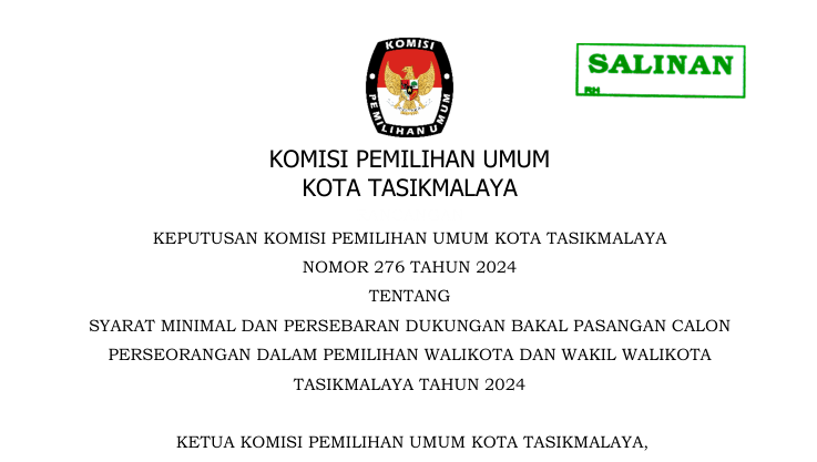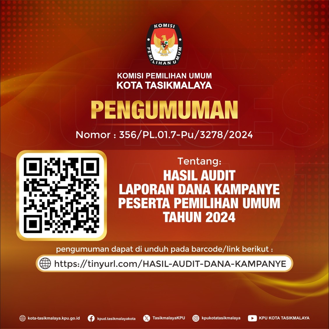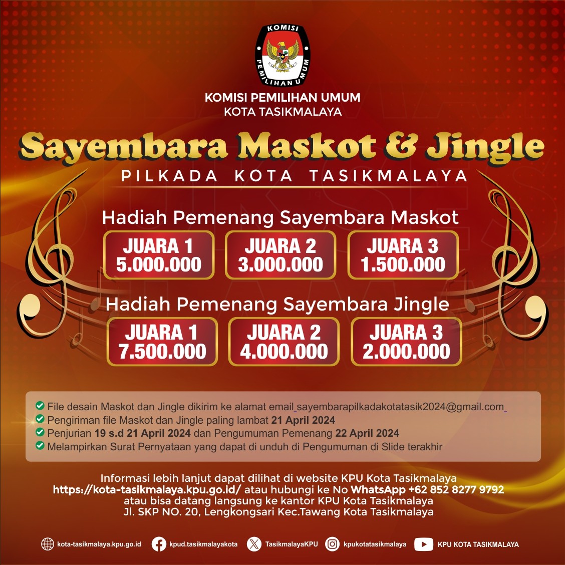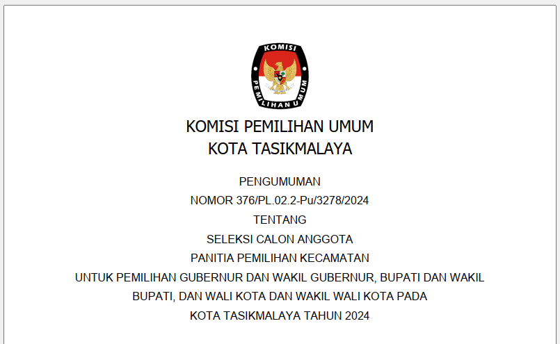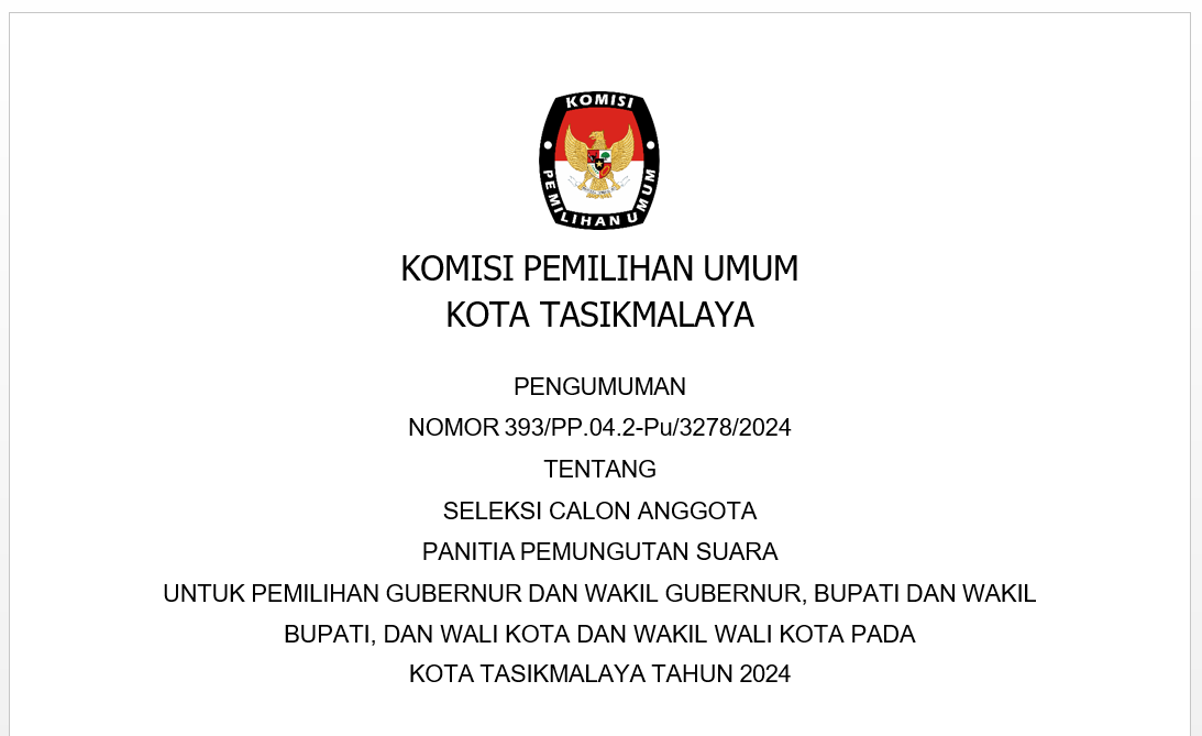 Dalam rangka pembentukan Calon Anggota Panitia Pemungutan Suara untuk Pemilihan Gubernur dan Wakil Gubernur, Bupati dan Wakil Bupati, dan Wali Kota dan Wakil Wali Kota Tahun 2024, Komisi Pemilihan Umum Kota Tasikmalaya mengundang Warga Negara Indonesia yang memenuhi kualifikasi untuk mendaftarkan diri menjadi Panitia Pemungutan Suara untuk Pemilihan Gubernur dan Wakil Gubernur, Bupati dan Wakil Bupati, dan Wali Kota dan Wakil Wali Kota dengan ketentuan sebagaimana tercantum dalam pengumuman.