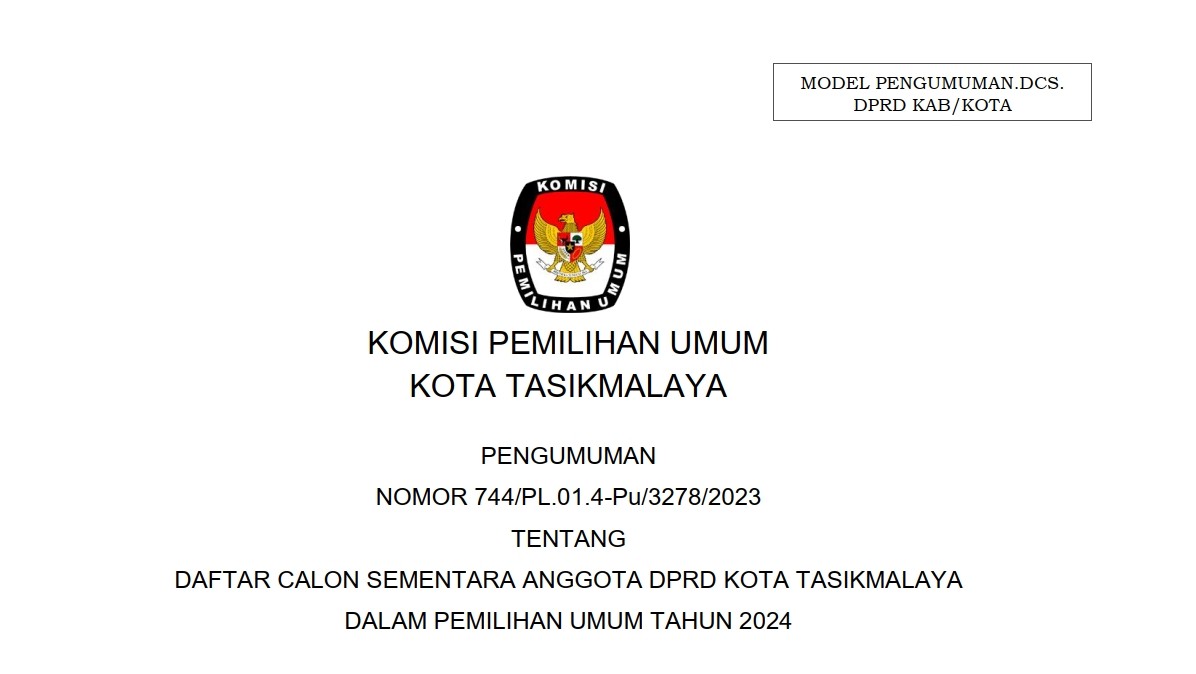 Daftar Calon Sementara Anggota DPRD Kota Tasikmalaya pada Pemilu Tahun 2024 Jumat, 18 Agustus 2023 20:23 3187 Daftar Calon Sementara Anggota DPRD Kota Tasikmalaya pada Pemilu Tahun 2024 silahkan masyarakat memberikan tanggapan dan masukan Klik untuk Unduh Dokumen Baca Selengkapnya