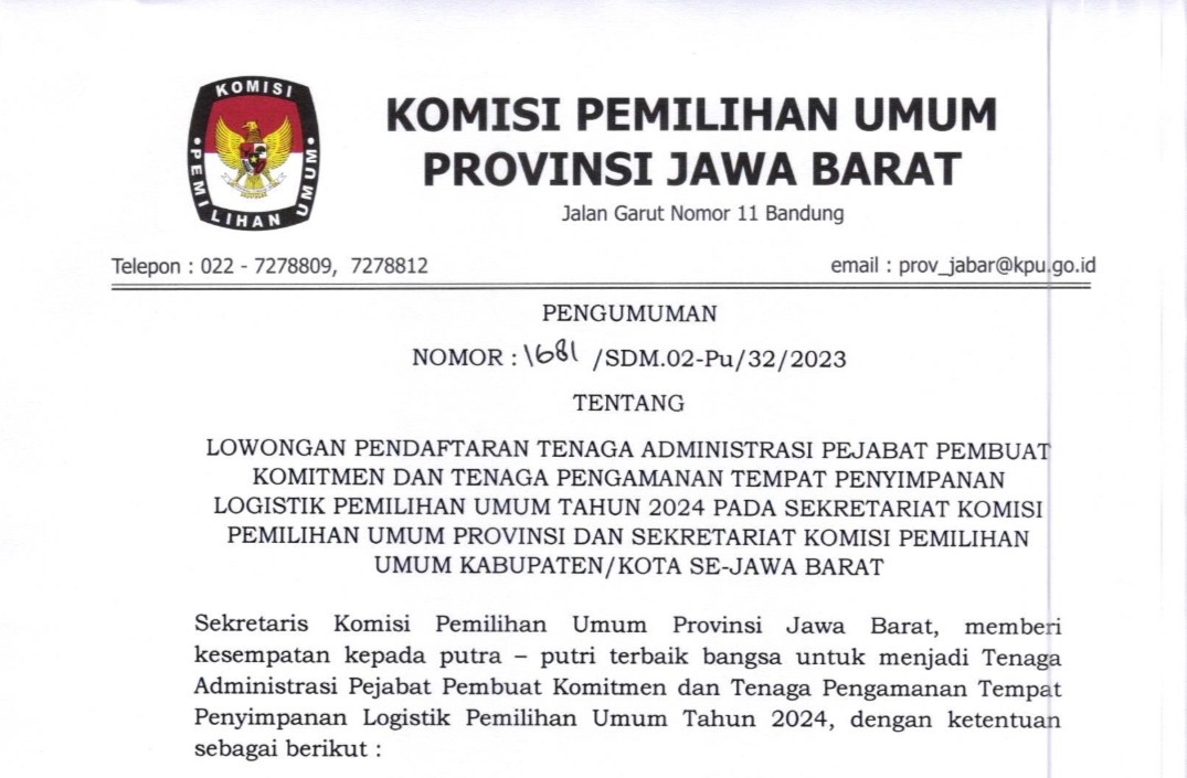 Pengumuman Pendaftaran Bakal Calon Anggota KPU Provinsi Jawa Barat Senin, 15 Mei 2023 11:00 999 Baca Selengkapnya