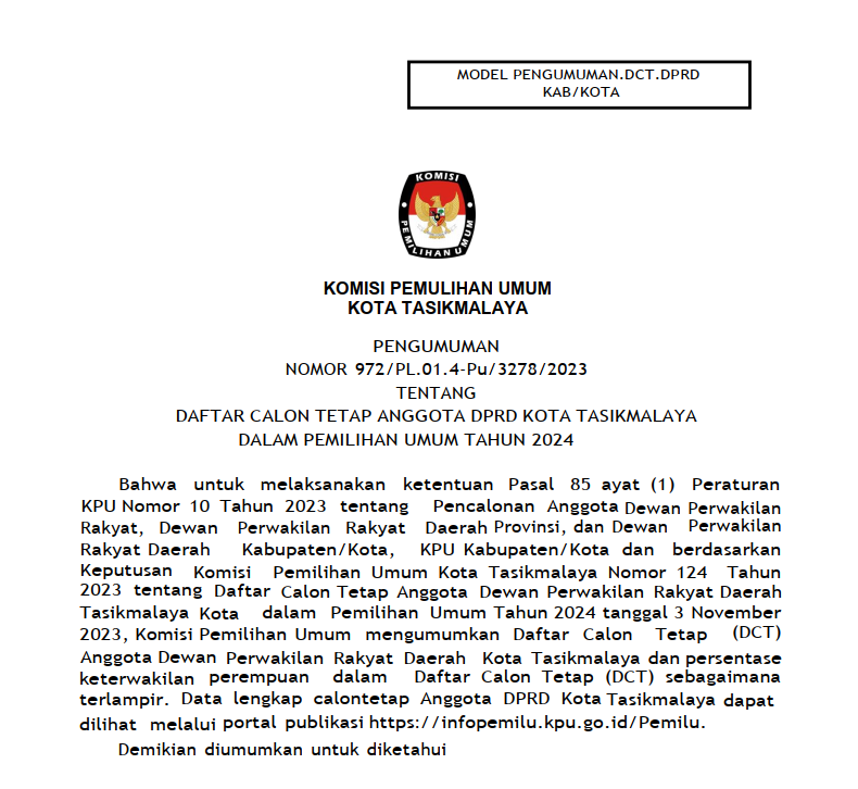 PENGUMUMAN DAFTAR CALON TETAP ANGGOTA DEWAN PERWAKILAN RAKYAT DAERAH KOTA TASIKMALAYA PADA PEMILU TAHUN 2024 Sabtu, 04 November 2023 00:31 1242 Silahkan Unduh File dibawah ini: Baca Selengkapnya